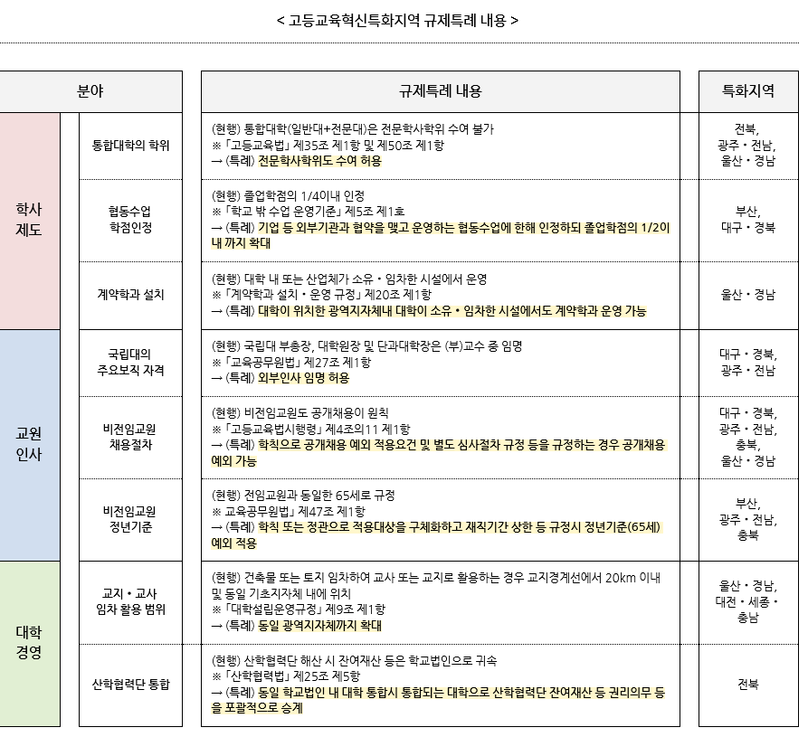 이번에 신규 지정된 지역은 부산, 대구‧경북, 전북이며, 광주‧전남 등 이미 지정된 4개 특화지역은 더 많은 규제특례를 적용받을 수 있도록 변경 지정되어 특화지역은 총 7개 지역(광역지자체 기준 12개 시도)으로 확대되었다. 이로써 학사제도, 교원인사, 대학경영 분야 총 18건(중복 제외시 8건)의 규제특례가 추가 적용된다.